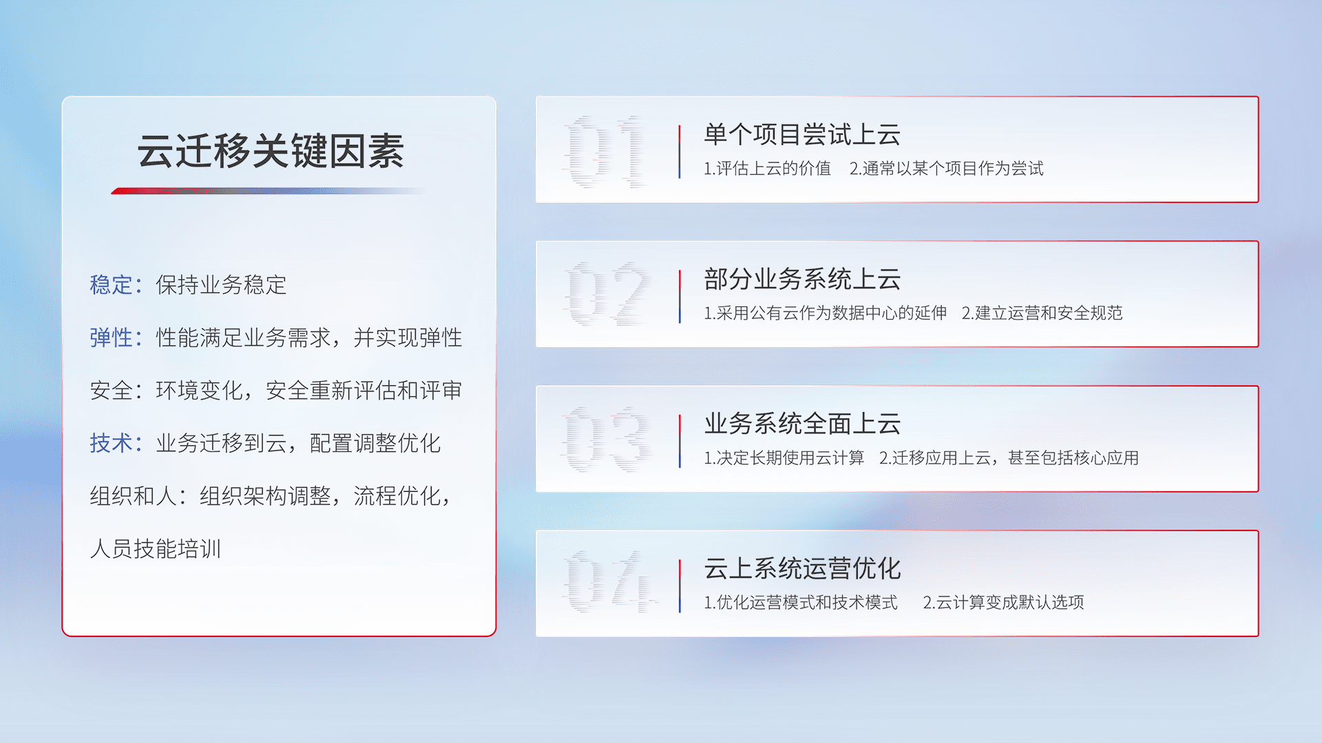 结合实际业务,,从规划设计、、、、云平台选型、、云原生改造、、、数据迁移、、、集成交付,,,迁移全过程为客户识别最佳上云路径,,做好风险识别管理,,,,设计网络架构、、、、身份权限、、、、安全审计合规、、、操作审计、、日志审计、、监控告警策略、、、、多站点容灾设计等,,,对云上基础设施进行整体规划,,,,提升IT治理水平,,,以满足弹性、、、、高可用、、高性能的需求。。。。